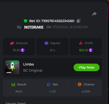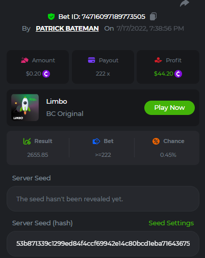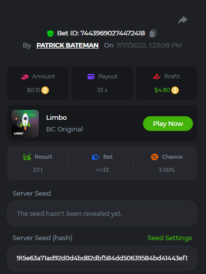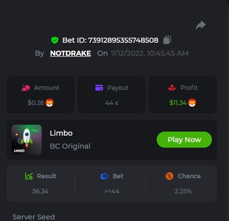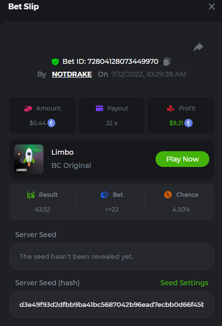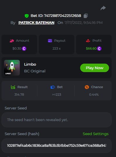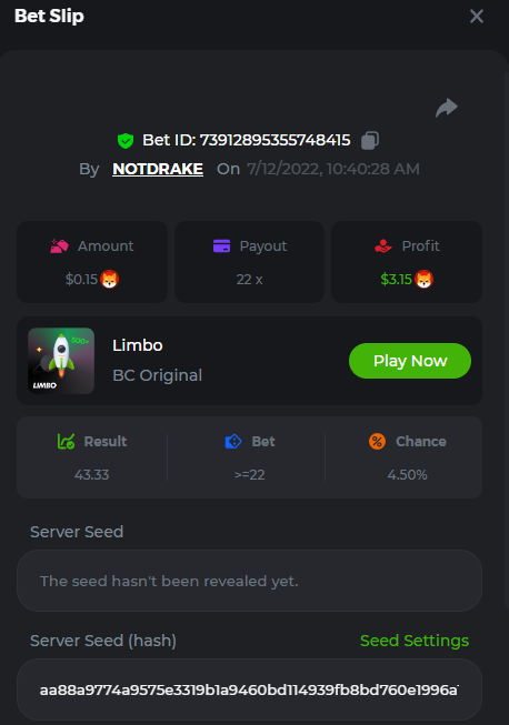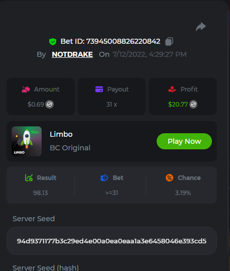 1. don't know how i can get the url for these bets but they are in my transaction history. https://hash.game/sd/?sd=10Q525VMSYVSWJ