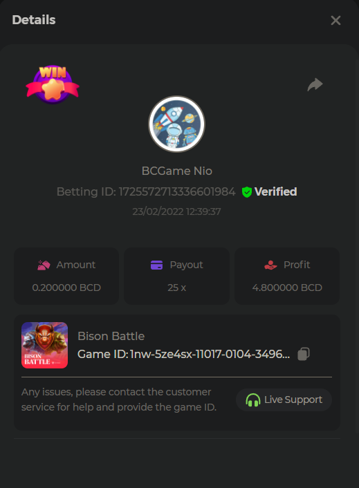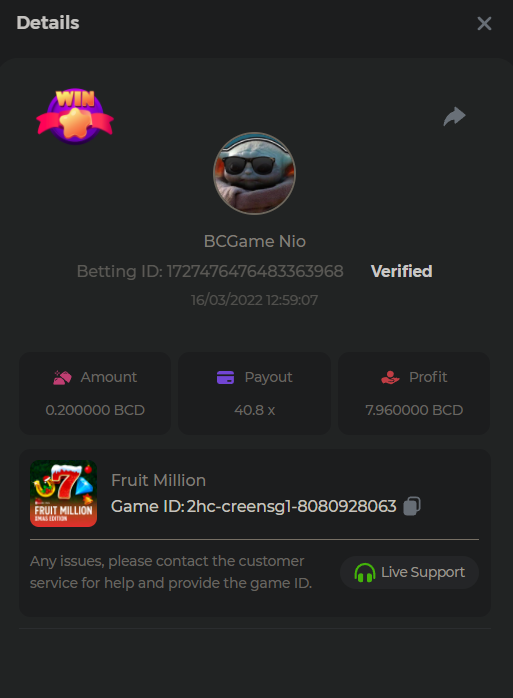 $2k Prestige Keno Challenge #22 ⚿ Greetings VIPs! This week we have KENO Challenge, with a total prize pool of $2000. The top 10 players who hit the unique payouts on Keno or Keno Multiplier will receive the major prize, in addition, each eligible entry will also get a share from the pool – Check out below the requirements. What's the Challenge? Complete as many of the following 20 payouts on either KENO or KENO Multiplayer. Must be a exact muliplier. | 5.10x | 11x | 17x | 26x | 30x | 56x | 63x | 81.5x | 100x | 180x | 250x | 270x | 350x | 450x | 500x | 600x | 710x | 800x | 900x - 1000x | Each payout you hit above counts as 1 point (Maximum 1 point for each payout). If there is a tie, the player with the higher average bet amount (in USD) shall be the winner. Minimum VIP There's no minimum VIP level Minimum Payouts Hit at least 3 payouts to qualify Minimum Bet Size $0.10 USD equivalent Eligible Coins All cryptocurrencies are eligible (excepting JB, and BCL) Available Prizes 1st Place....... $500 2nd Place..... $300 3rd Place...... $200 4th Place......$100 5th Place......$50 6th-10th.........$30 The remaining $700 will be split between all other players who reach the minimum target multiplier, min bet and minimum VIP. How to Enter To enter, copy the link of the bet you'd like to submit. Once you've copied it, paste it as a reply to this thread like so: Link: https://bc.game/sd/?sd=10GT450UX7SN4J In the same post, upload a screenshot of your win by clicking the game ID WITH VIEW IN USD mode ENABLED (accessible at the bottom of dropdown menu for your wallet up top. This way, we can ensure that your bet indeed met the minimum requirement at the time of placing it: Link: https://bc.game/sd/?sd=10GT450UX7SN4J Please combine all of your hits together in a SINGLE post. Edit your existing post for additional hits, don't create a new post. Bets must be posted within 24 hours of placing bet in order to keep things fair for everyone. Bets must be made during the specified time window stated above. This thread will lock automatically when the time period is over. One (1) entry per household. Anyone found attempting to win multiple prizes will be disqualified from this challenge as well as all future challenges. Failure to follow instructions will result in your submission being null and void. By entering this challenge, you acknowledge that BC.Game has the final decision on results and placement. Payouts will be made within 72 hours of challenge completion, please be patient, we promise you that we haven't forgotten. We check and double check to make sure the rightful winners receive their prize. Prizes will be paid out in BCD. Good luck to everybody!