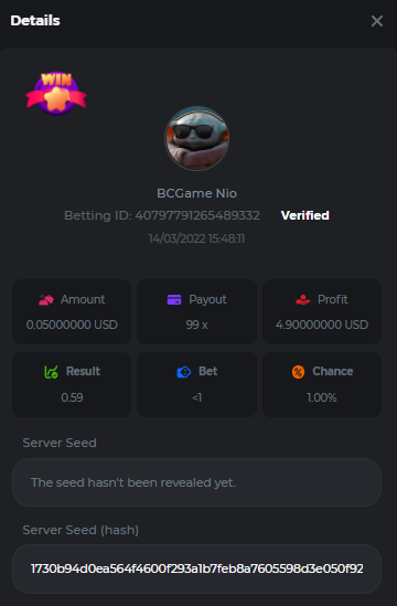 $2k Prestige Classic Dice Challenge #21 Welcome back VIPs, we're hosting a Prestige Challenge this week for the luckiest Top 10 who reach most of the unique payouts on Classic dice, with a total prize pool of $2000. Plus, we are grateful to all participants and each eligible entry will also get a share from the pool – See rules details below for more information. What's the Challenge? Complete as many of the following 25 payouts on our in-house Classic Dice. Must be a winning bet. | 5x | 15x | 25x | 33x | 44x | 55x | 66x | 75x | 90x | 99x | 100x | 150x | 180x | 220x | 300x | 330x | 396x | 450x | 550x | 825x | 900x | 1100x | 2475x | 3300x | 4950x | Each payout you hit above counts as 1 point (Maximum 1 point for each payout). If there is a tie, the player with the higher average bet amount (in USD) shall be the winner. Minimum VIP There's no minimum VIP level Minimum Payouts Hit at least 3 payouts to qualify Minimum Bet Size $0.05 USD equivalent Eligible Coins All cryptocurrencies are eligible (excepting JB, and BCL) Available Prizes 1st Place....... $500 2nd Place..... $300 3rd Place...... $200 4th Place......$100 5th Place......$50 6th-10th.........$30 The remaining $700 will be split between all other players who reach the minimum target multiplier, min bet and minimum VIP. How to Enter To enter, copy the link of the bet you'd like to submit. Once you've copied it, paste it as a reply to this thread like so: Link: https://bc.game/sd/?sd=10GBQL8EAFSJRN In the same post, upload a screenshot of your win by clicking the game ID WITH VIEW IN USD mode ENABLED (accessible at the bottom of dropdown menu for your wallet up top. This way, we can ensure that your bet indeed met the minimum requirement at the time of placing it: Link: https://bc.game/sd/?sd=10GBQL8EAFSJRN Please combine all of your hits together in a SINGLE post. Edit your existing post for additional hits, don't create a new post. Bets must be posted within 24 hours of placing bet in order to keep things fair for everyone. Bets must be made during the specified time window stated above. This thread will lock automatically when the time period is over. One (1) entry per household. Anyone found attempting to win multiple prizes will be disqualified from this challenge as well as all future challenges. Furthermore, you will go on the WALL OF SHAME for all to see that you are a scam. Scam 4 Scam. Failure to follow instructions will result in your submission being null and void. By entering this challenge, you acknowledge that BC.Game has the final decision on results and placement. Payouts will be made within 72 hours of challenge completion, please be patient, we promise you that we haven't forgotten. We check and double check to make sure the rightful winners receive their prize. Prizes will be paid out in BCD. Good luck everyone!