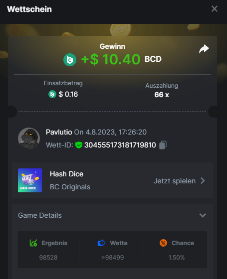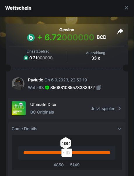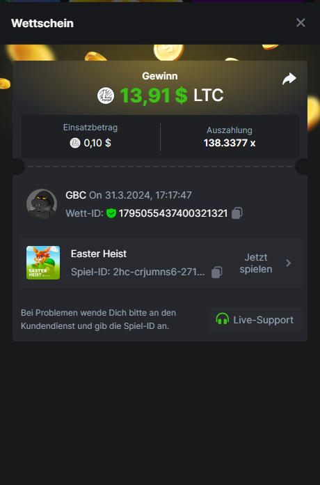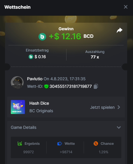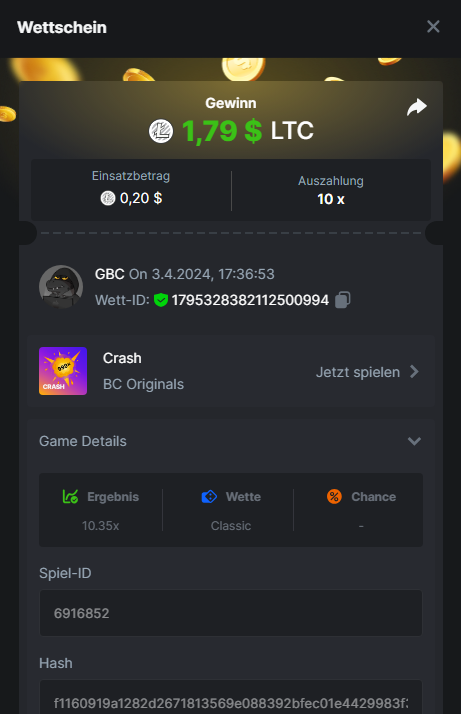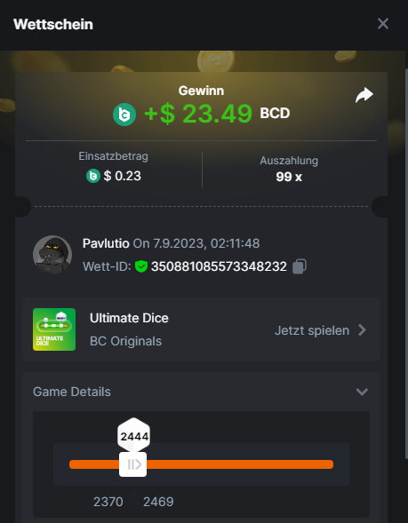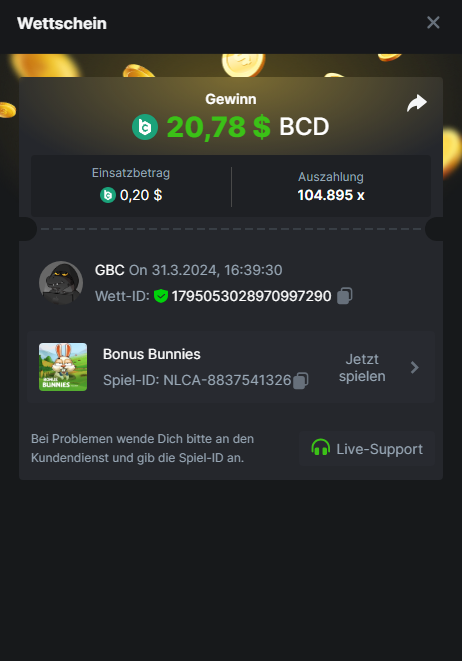 1. Classic Dice x10 https://bc.game/#/sd/11VLHRJG9EDT1F Run away Zombies 10x https://bc.game/#/sd/11VLIIWJAYVR4R Baccarat 9x https://bc.game/#/sd/11VLJ1UIYLB03N John Wild 20x https://bc.game/#/sd/11VLJCRRPWKMO7 Twist 15.5x https://bc.game/#/sd/11VLJVMYZJP89N Hello Easter 20X https://bc.game/#/sd/11VLKHQJX5UFX7 Lucky Easter 30X Red Tiger https://bc.game/#/sd/11VLKVPZ7TD0S7 Plinko 76x https://bc.game/#/sd/11VLNHKXB2B94Z Keno 50X https://bc.game/#/sd/11VLZXXWSETGEB Ring of Fortune 99X https://bc.game/#/sd/11VM109IJOCIBR Keno 259x https://bc.game/#/sd/11VMCHB3928KRF Limbo 500x https://bc.game/#/sd/11VMCSY8LKEMYV Roulette Singe 36x https://bc.game/#/sd/11VSMS95Z2L4P7 Wheel 29.7x https://bc.game/#/sd/11VSNGSS4B8GRR Bonus Bunnies 100x https://bc.game/#/sd/11VSP85GLT76DN Easter Heist 90x https://bc.game/#/sd/11VSSCFCBR49R3 Crash 10x https://bc.game/#/sd/11W08C2OE5G03B Black Jack Player 3!!! Statistik do not work correkt https://bc.game/#/sd/11W0B3OVLQ3INF