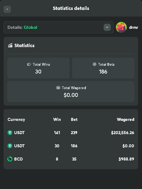 5. Hey @Liquidwalker we just did a brief check on UID: 65958920 on your request! He’s a sports bettor! Sports wagers don’t reflect in the main profile wager counter (casino only), which is why you see “$0” there. Checking Statistics > Details shows the real picture: 239 bets in USDT $202,556+ wagered So his raffle entry is fully valid. He is doing well! He is already rocking a 10k Profit Medal 'Chicken Dinner' while some of us are still grinding for years.