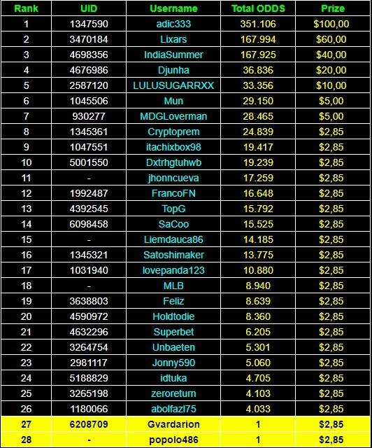 1. $300 BC.GAME SPORTS PARLAYS CHALLENGES #30 Start: 14, Nov 00:00 UTC Ends: 20, Nov 23:59 UTC Hello, ladies and gentleman! Sports Parlay Challenges #30! With a prize pool of $300, the Top 7 takes home a grand prize, and the remaining $60 will be split among all other entrants! What is the challenge? Win a multi-bet with at least x4 by betting on at least 4 matches (all sports) All bet slips must be posted open! Any closed published bet slip will be disregarded! The ODDS for each game will be added up and counted as total points. Voided, half-loss, and half-win bets aren't eligible for the challenge! Cashed-out bets aren’t eligible for the challenge. Using the same odds on a single bet slip isn't allowed Providing the bet link isn’t mandatory Minimum VIP No Minimum VIP Level Minimum payment Multiplier minimum 4x, however, only the top 7 winning parlay multipliers will win the grand prize! Minimum bet size Equivalent to U$$ 1 Eligible currencies All cryptocurrencies are eligible (except JB) Rewards available 1st place.......$100 2nd place.....$60 3rd Place...... $40 4th Place...... $20 5th Place...... $10 6th Place...... $5 7th Place...... $5 The remaining $60 will be split among all other participants who meet the minimum requirements and minimum stake. How to enter: To participate, post your Ticket ID, along with your Parlay link, as a reply to this thread as follows: Link bet: https://bc.game/sports/?bt-path=%2F%3FbtBookingCode%3D561A9D1 + Ticket ID 2126602890796736992 Along with the screenshot of your accumulated ticket. See how to get your sports bet link below! https://imgur.com/a/BRSyxVE Ticket ID 2126602890796736992 If a selection results in a void or push, the bet will remain eligible as long as it remains equal to or greater than a triple bet and meets the odds requirements. Bets withdrawn will not be counted. Please combine all your hits into a SINGLE post. Edit your existing post to get additional hits, don't create a new post. Bets must be placed during the time window specified above. This thread will automatically lock when the time period ends. One (1) entry per family. If someone finds multiple prizes, they will be disqualified from the challenge as well as all future challenges. Failure to follow the instructions will result in the cancellation of your submission. By entering this challenge, you acknowledge that BC.Game has final decision rights over results and placement.