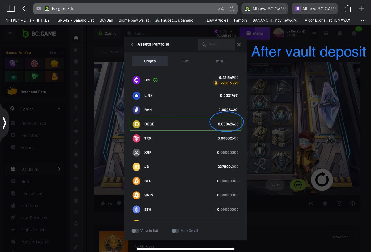 2. Unplayable dust decimal deposit into vault leaves the decimal balance stuck on player account balance until page is refreshed.