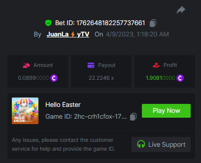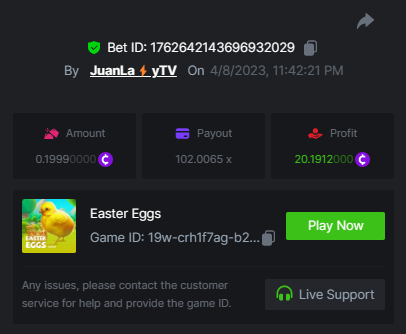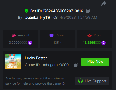 8. Easy 1. Win a Classic Dice bet with a 5x payout. https://bc.game/#/sd/11753S5GFRO2KZ 2. Win a 'Tie' 9x bet on the Baccarat. (no spread bets) https://bc.game/#/sd/11753V9Z4OZI1F 3. Get a 10x payout on a Crash bet. Make sure you catch the moon. https://bc.game/#/sd/117664TZCBXQFN 4. Get a 10x payout on the Egyptian Adventure. https://bc.game/#/sd/11754QJ7EREADV 5. Get a 20x payout on the Oriental Beauties. https://bc.game/#/sd/117556Q0HIN2FN 6. Win a Cave of Plunder bet on 7.50x payout (Completing all book symbols). https://bc.game/#/sd/11755DC2MO0W7N 7. Win a Sports bet with minimum odds being 1.5x (singles only) 1$ base min amount. 2256443882550203095 8. Get a minimum 20x multi on BGaming Hello Easter slot. https://bc.game/#/sd/1176DZOUF7HQ8J 9. Get a minimum 30x multi on Red Tiger Lucky Easter slot. https://bc.game/#/sd/1176EG3EDFI3V7 10. Enable 2FA for your BC.Game account + Verify E-Mail & Phone Number (If it's already activated, keep it activated). Medium 1. Win a bet in Roulette Single with betting on 0 only (36x). (no spread bets) https://bc.game/#/sd/117570EUE5982B 2. Get a 76x on Plinko. https://bc.game/#/sd/11761FG36E85CJ 3. Win 99x multi on Ring of Fortune. (no spread bets) 4. Win a Sports bet with minimum odds of 2x (singles only) 1$ base min amount. 2256444139656851877 5. Win a bet with Straight Flush in Video Poker (60x). 6. Win a bet on Keno Single by selecting numbers 7, 30, and 8, Medium risk. (50x). https://bc.game/#/sd/117585JEUEVE37 7. Win a bet by getting a natural Blackjack (A+K/Q/J/10) with only red cards in it. 8. Get a minimum 90x multi on BGaming Easter Heist slot. 9. Get a minimum 100x multi on Play&Go Easter Eggs slot. https://bc.game/#/sd/11768H7D93BSB7 10. Get a minimum 100x multi on No Limit City Bonus Bunnies slot. Hard 1. Get a 49.50x on Wheel (50 segments, High risk). https://bc.game/#/sd/1175AL07QWGYDV 2. Get a 420x on Plinko (14 rows, High risk). 3. Win with a minimum 500x multi on Limbo. 4. Get a minimum 506.88x on Tower Legend. 5. Win with a minimum 999x on Crash. 6. Post a winning bet with 21 mines and 3 diamonds on Mines game, (569.25x). 7. Win a bet on Keno Single by selecting numbers 10, 11, 12 and 13, High risk, (259.00x). https://bc.game/#/sd/11758J3N21Q58Z 8. Get at least 300x multi on Pragmatic Play Rabbit Garden slot. 9. Get a minimum 300x multi on Wazdan Burning Sun Easter slot. 10. Win a Sports bet with minimum odds of 10x (any bet allowed) with 1$ base min amount.